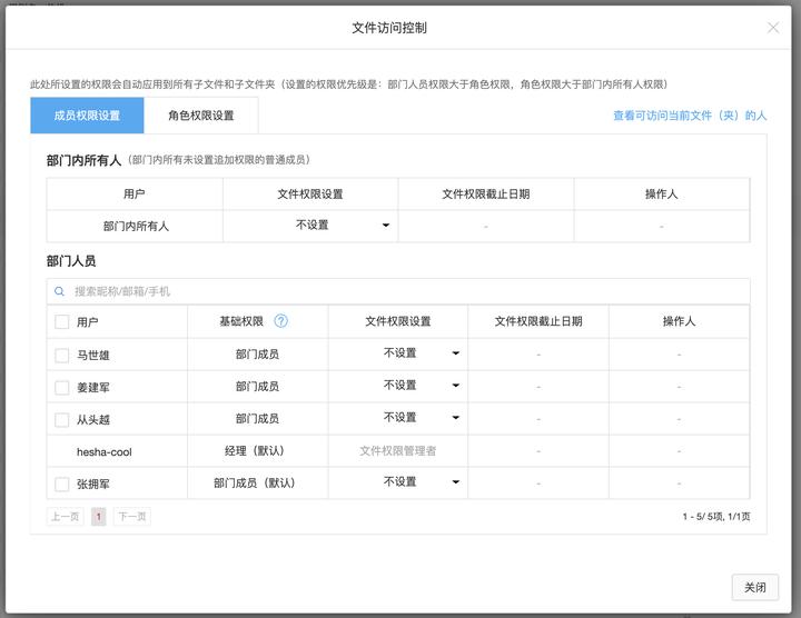 成员对部门文件的访问权限由成员在部门中的角色决定,角色也可以在后台自定义。