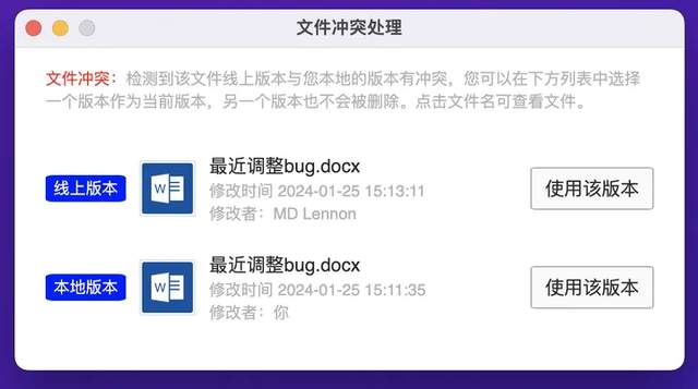 只要检测到本地文件和云端文件版本不同,并且编辑时间没有对上,就会弹出冲突提示,让用户选择使用什么版本作为当前版本。有点类似于知乎的文章版本冲突提示。不同的是,选择了一个版本作为当前版本后,另一个冲突的文件巴别鸟也会上传,成为上一个版本。有效防止用户误操作丢失文件内容。