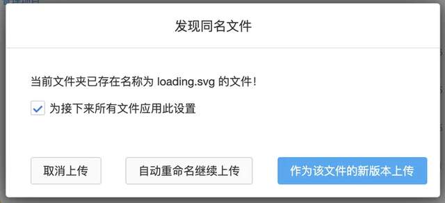 同名文件上传也可以选择保存为新的版本或者重新命名成为一个新的文件。任何时候,文件的管理者都可以把任意老版本设为当前版本。