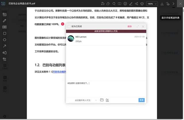 你也可以通过在文件内容上批注@相应的同事和说明细节。并且每个批注点都可以跟踪是否完成任务,每个批注点也是一个针对批注内容的讨论区,所有有权限的文件分享加入者都可以参与。