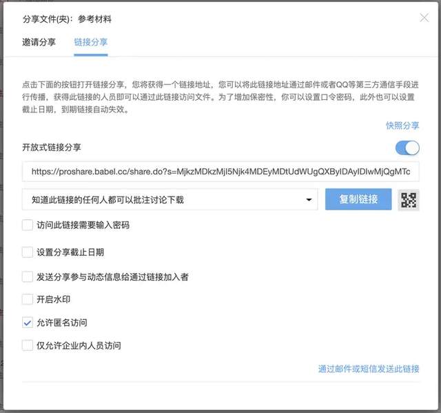 当然,巴别鸟也支持最常用的链接分享方式进行分享。并且,可以设定分享的权限、密码、分享有效期、是否允许匿名…..