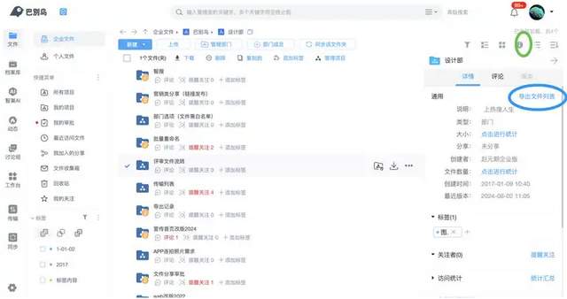选中你要导出的文件夹,点击查看详情按钮,在详情页面里点击导出文件列表。等待文件列表准备完毕自动下载就可以。