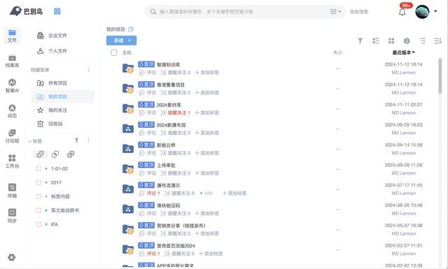 巴别鸟还提供了“我的项目”这个把项目单独呈现的入口,这样项目参与者也不用在意项目所在的部门,直接去访问项目即可。