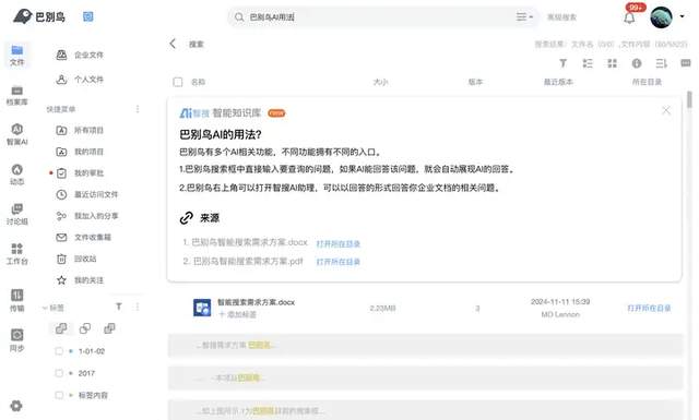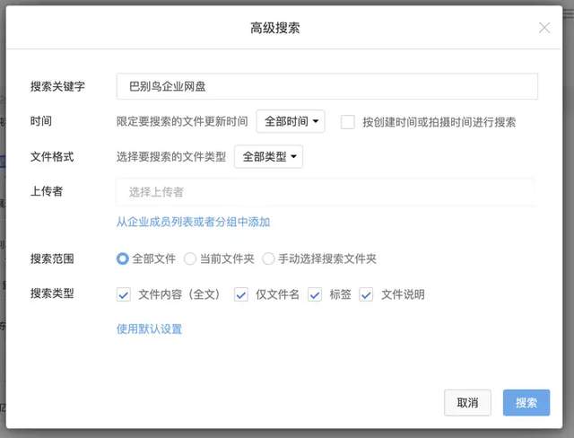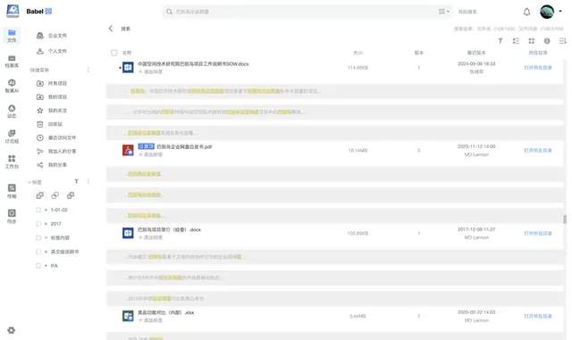 巴别鸟应该是搜索功能最强大的企业网盘之一,巴别鸟搜索有几个特性: