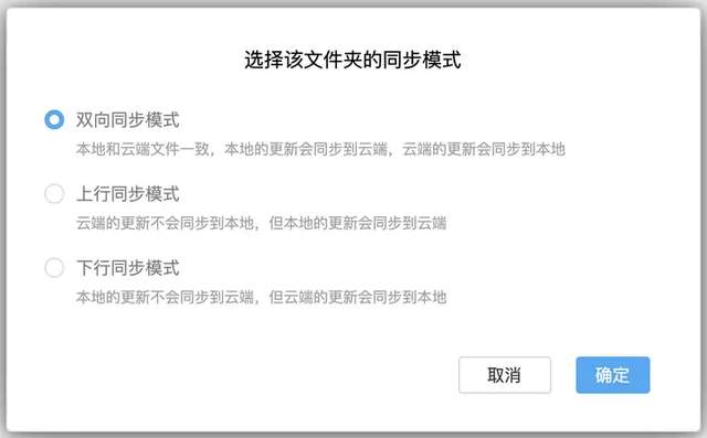 - 同步方式选择。不希望本地计算机的改动影响云端内容,但又希望看到最新的文件更新?需要自动下载最新的文件?或者云端的文件更新不要影响到本地,本地的更新却可以自动同步到云端?这就需要支持不仅双向也可以单向的同步方式。