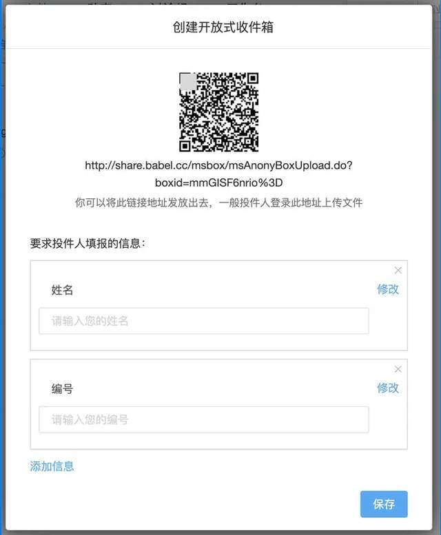 收集标书、征集比赛文件、学生交作业。巴别鸟可以创建特殊的收件箱以快速收集文件。收件箱支持匿名收集文件。