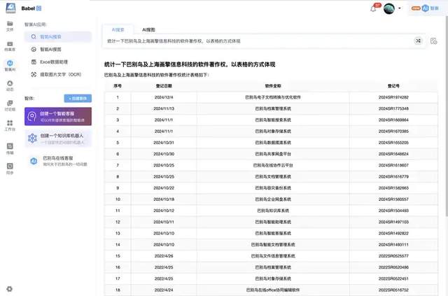 我只要在巴别鸟里提问“统计一下上海画擎信息科技的软件著作权,以表格的方式体现“