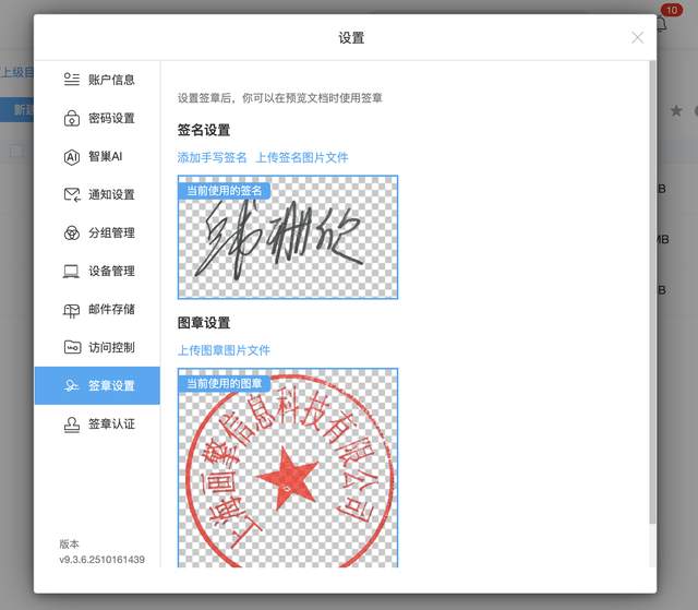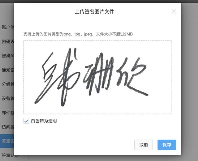 在签章设置里上传签名及公章图片,这里最好把“白色转为透明”选项打勾。