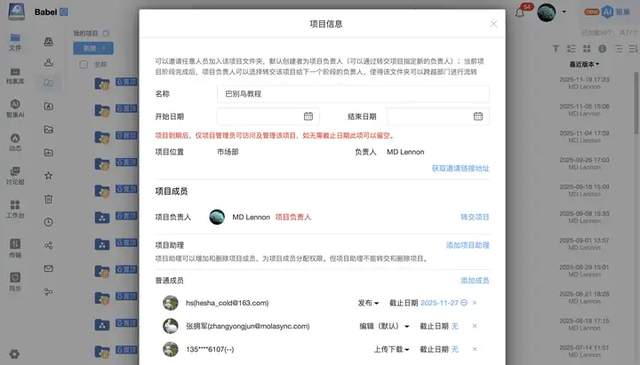 建立一个项目,把想要邀请的企业成员及外界成员拖进来就可以,能用手机号,能用邮箱,并且加入的成员可以精细化管理,相当简单。