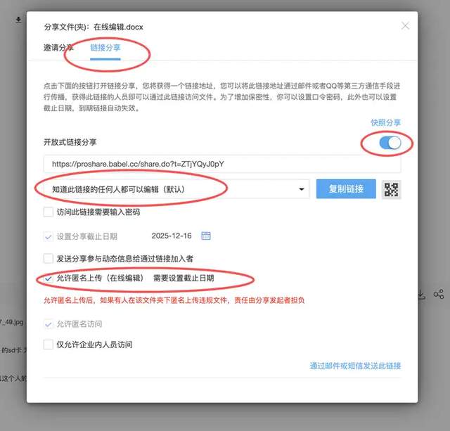 这里要注意几个点,1.权限要给编辑权限。2.如果需要对方匿名访问编辑(就是不注册)要打开允许匿名上传。