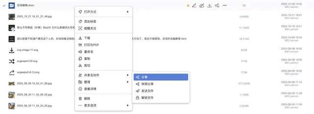 然后要其他人一起编辑,邀请他们访问就好,右键点击文件,共享及协作——分享